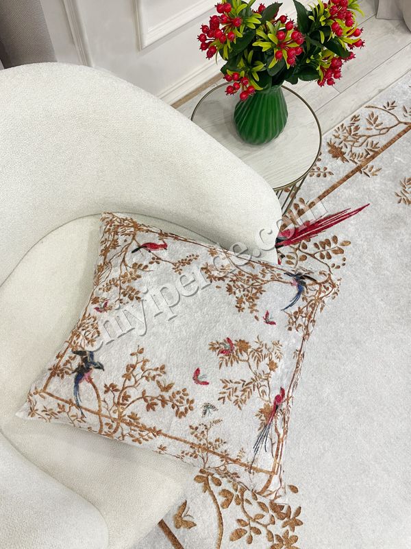 GRİ- Nakış İşleme Görünümlü Kuşlu Kırlent