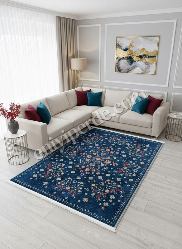 LACİVERT Blue Floral Vintage Lateks Taban Halı