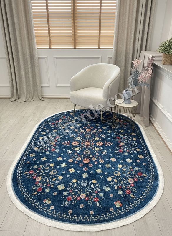 LACİVERT Blue Floral Vintage Lateks Taban Halı