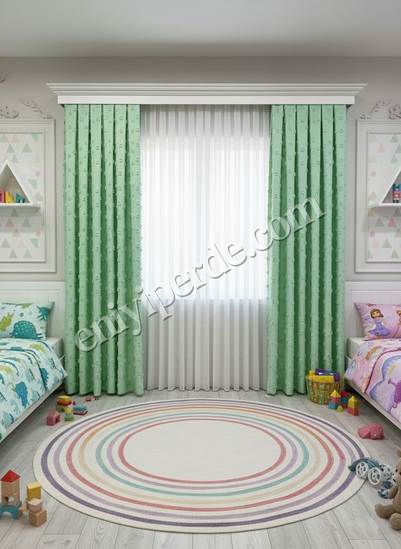 Yeşil Renk Çocuk Odası Ponponlu Pufy Fon Perde 1/3 SIK Pile